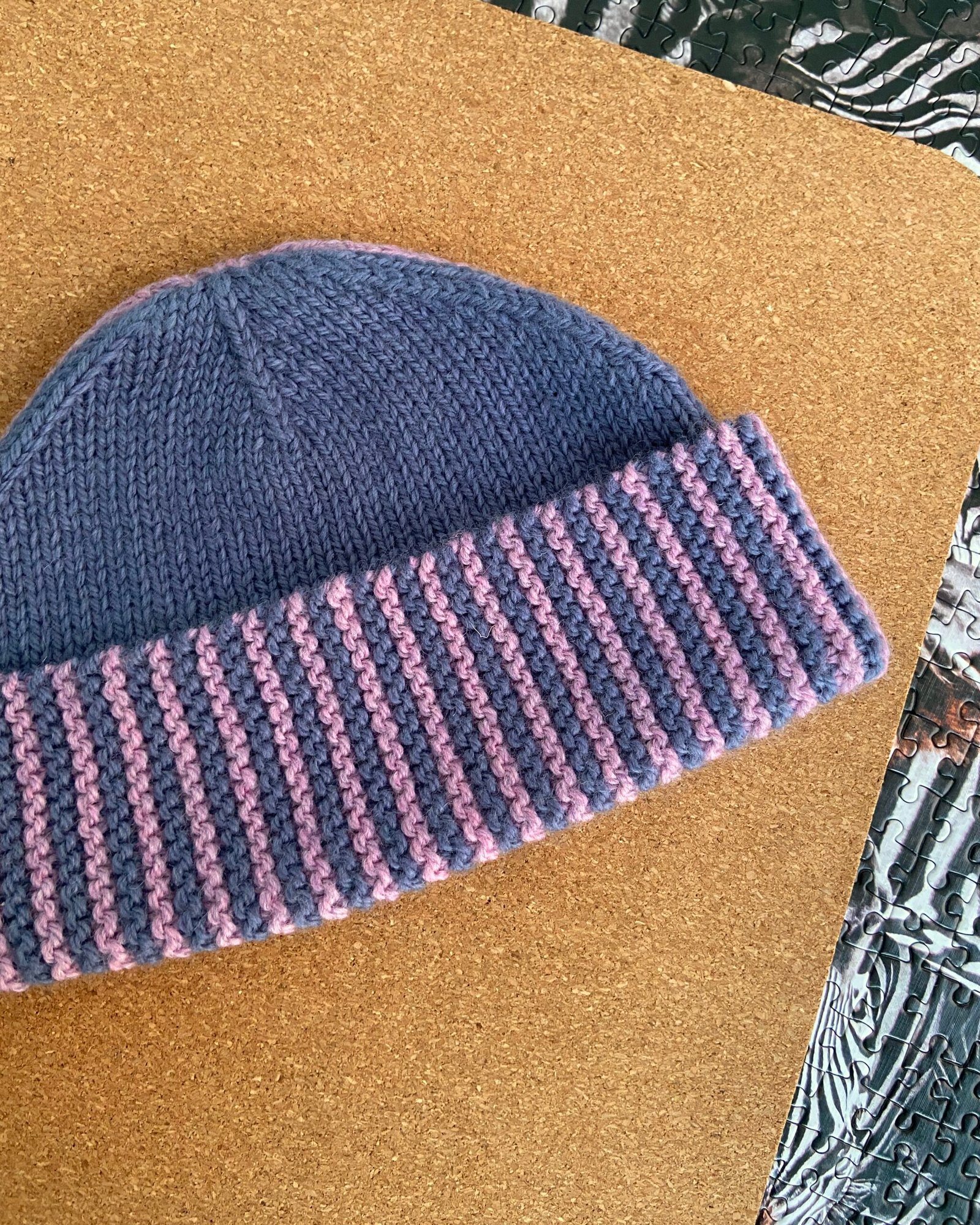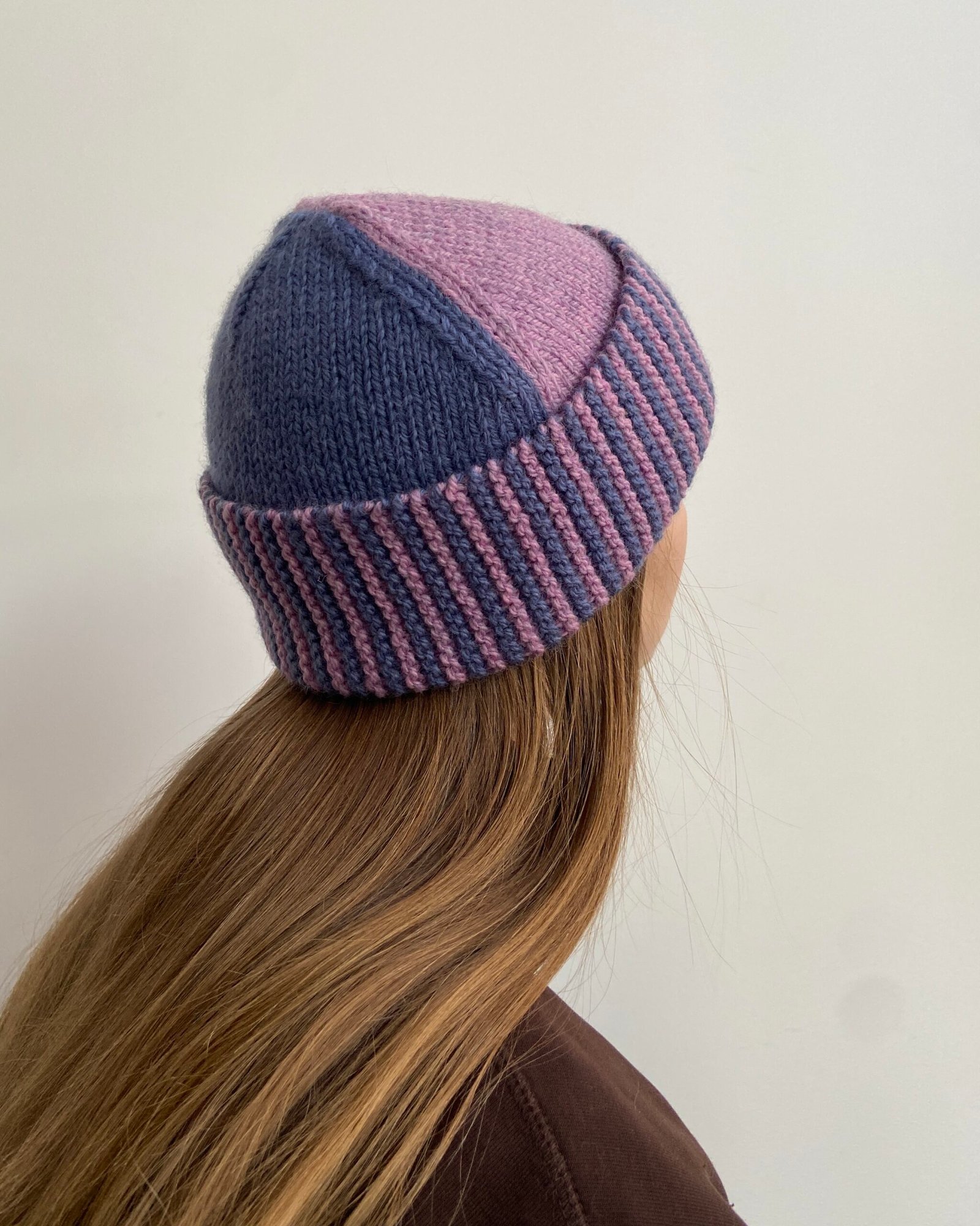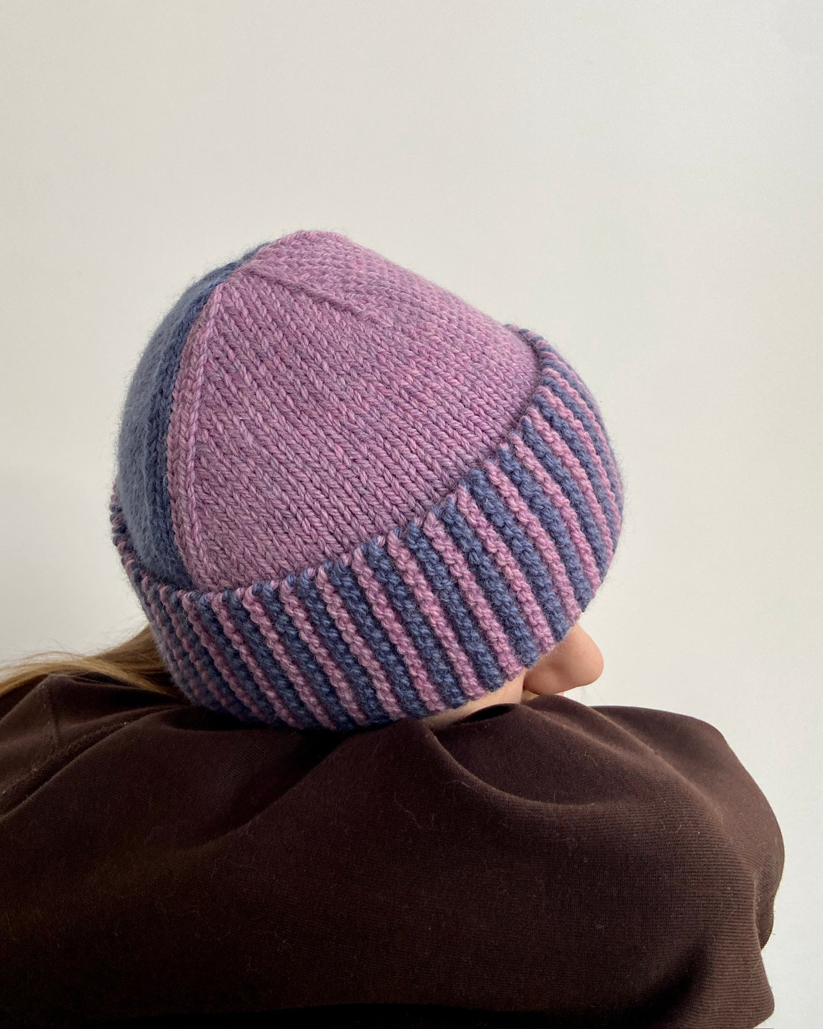 Demi hat is worked entirely flat. First, the brim of the hat is worked sideways in garter stitch using both colors and is joined to create a tube using Kitchener stitch. Then, stitches are picked up from the brim, and one side of the hat is worked in color A. After that, the other side of the hat is worked in color B. Lastly, the hat is sewn at the side edges using mattress stitch.