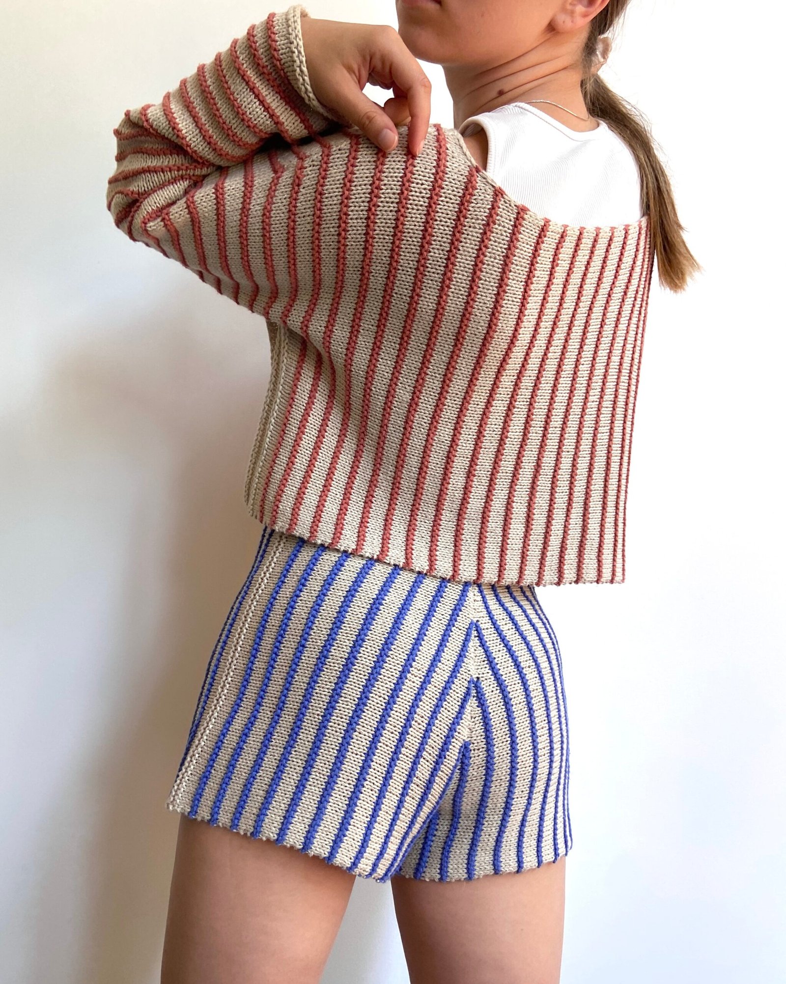 Gelma set includes Gelma sweater and Gelma shorts knitting patterns. You can also purchase these knitting patterns separately.